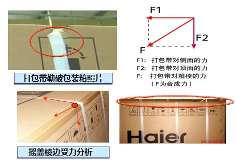 分析:针对这一问题,海尔集团包装模块找出造成缺陷的主要因素:包装箱易破的薄弱部位为摇盖折弯处,打包带勒紧时此处受的勒紧力最大,最容易被勒破(见受力分析)。对策:强化摇盖折边处的(局部)强度,在摇盖折弯处粘贴加强胶带,增加其韧固性,避免勒破摇盖。