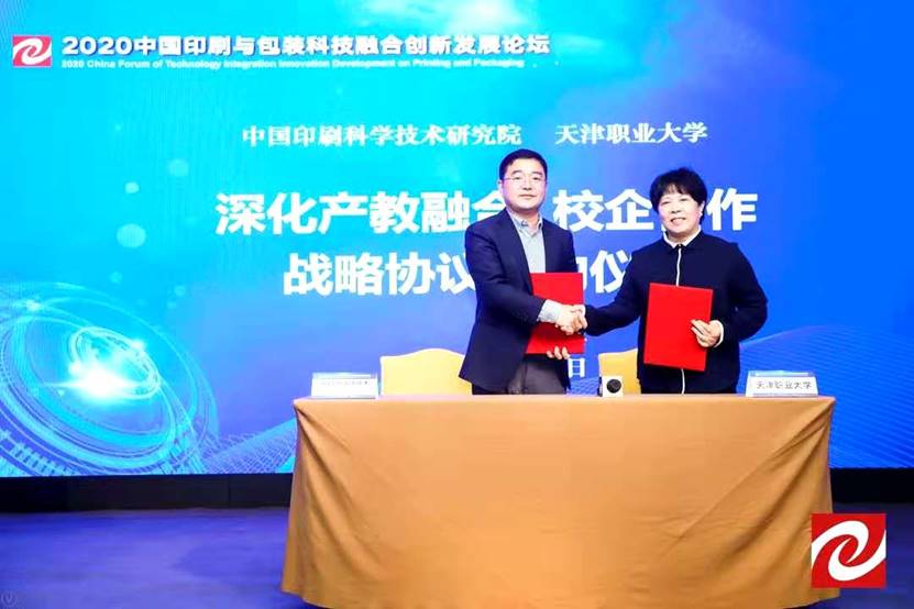 科技融合创新发展论坛的最后一个环节——中国印刷科学技术研究院与天津职业大学的深化产教融合、校企合作战略协议签约仪式将活动推向高潮。中国印刷科学技术研究院院长赵鹏飞、天津职业大学副校长杨荣敏分别代表双方签定合作协议。本次合作旨在根据产业链高质量发展需要,共同探索培养高质量技能型人才的职业教育模式。中印科院将利用自身综合资源为院校更好推进产教研融合发展助力,合力为印刷包装行业的健康发展提供人才支撑。
