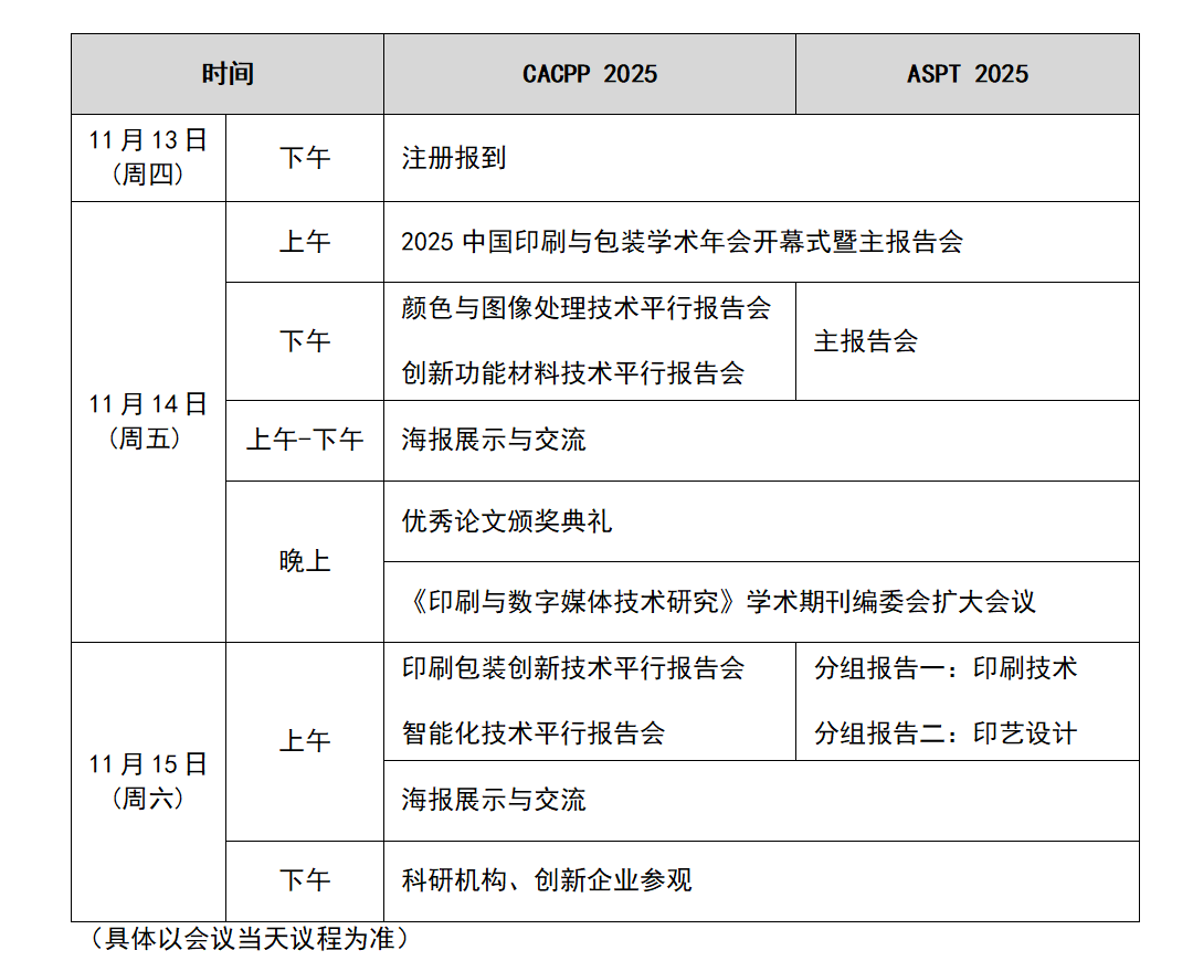 2.2025第16届中国印刷与包装学术年会(CACPP 2025)与2025第15届亚洲印刷技术研讨会(ASPT 2025)同期举办,共包括2场主报告会、4场平行报告会、2场口头报告会以及创新企业参观等环节。主报告会将邀请国内外相关研究领域的知名学者发表图像处理与智能识别、智能装备制造、具身智能、可持续包装、先进功能材料、纸基材料等方面的大会主旨报告。同时,还将邀请来自印刷、包装及相关学科领域的知名教授、青年学者以及致力于科研创新的一线科研工作者在平行报告会上分享各专业技术方向科研成果、产业化成果。最后,将走进西安市创新企业及科研机构进行实地参观,促进“产”“学”“研”“用”四个层面深层次的创新交流与合作。