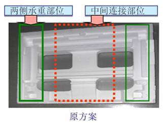 分析问题:该款产品的结构特点,其包装着力部位在底座的两侧。中间部位主要起连接作用,因此,底座中央的泡沫就是过剩的包装部分。