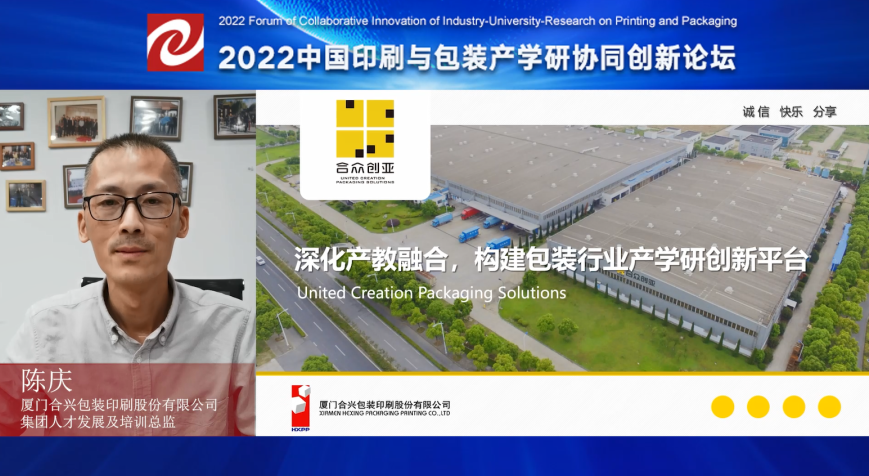 厦门合兴包装印刷股份有限公司集团人才发展及培训总监陈庆以“深化产教融合,构建包装行业产学研创新平台”为题,针对行业痛点问题,提出产学研协同创新的方案、思考与探索,分享了厦门合兴多年来在产学研合作方面所做的多项工作,最后,提出希望未来可以与更多的院校或团队在专业人才培养、核心技术开发、科学管理与创新能力打造方面开展合作。