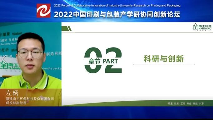 福建南王环保科技股份有限公司首席技术官邝仕能首先介绍了南王科技的基本情况,然后,研发部副经理左杨分享了南王科技多年来在科技创新方面取得的成绩,并以问题为导向,重点发布了企业多个项目合作需求,涉及印前技术革新、印刷装备改造、印刷流程升级、新材料(无氟防油纸、功能性涂料等)研发和新产品(涂层纸杯等)开发等方面。最后,邝仕能发布了公司研发总监、产品开发工程师、实验室授权签字人等岗位人才需求信息。