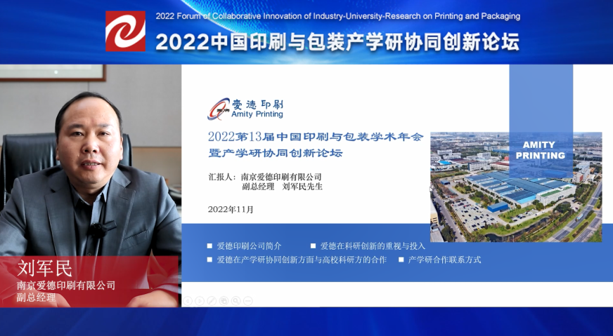 南京爱德印刷有限公司刘军民副总经理表示多年来爱德印刷一直高度重视科研创新,每年约投入1000多万元在项目研究、流程升级、新品开发等创新工作上,已与北京印刷学院、南京林业大学、上海出版印刷高等专科学校等10余所高校建立科研合作关系。他重点发布了包括数字化薄纸张小批量生产、新材料跨行业开发、印刷流程升级、智能化工厂构建在内的科研合作需求。